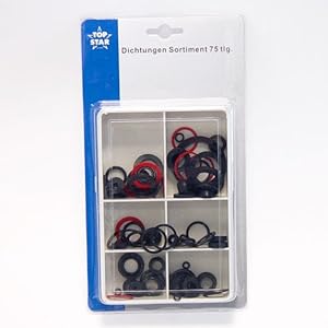 .Ein 75 teiliges Dichtungs-Set, bestehend aus verschieden großen Dichtungen für den Sanitärbereich. Die Dichtungen befinden sich in einer 6 fächrigen Box mit Deckel.